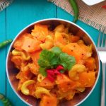 - Cuando la calabaza esté blanda, salpicar con la harina de garbanzo tostado y cocinar durante 2 minutos más. Probar y sazonar si es necesario. Servir decorado de hojas de cilantro fresco y arroz o naan.
