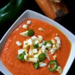 El salmorejo preparado al estilo tradicional es muy espeso, a veces parece más a una salsa para untar que una sopa. Puedes ajustar la consistencia a tu gusto: si te parece demasiado espeso puedes añadir un poco más de aceite de oliva o agua, si te parece demasiado aguado (probablemente no será el caso) puedes añadir un poco más de pan. Tradicionalmente el salmorejo lleva huevo duro y jamón serrano de decoración, pero existen variaciónes y no hay reglas fijas. He hecho el mío vegetariano reemplazando el jamón por pimiento morrón. Disfruta de esta sopa para almorzar en un día caluroso de verano o de aperitivo para una cena deliciosa.