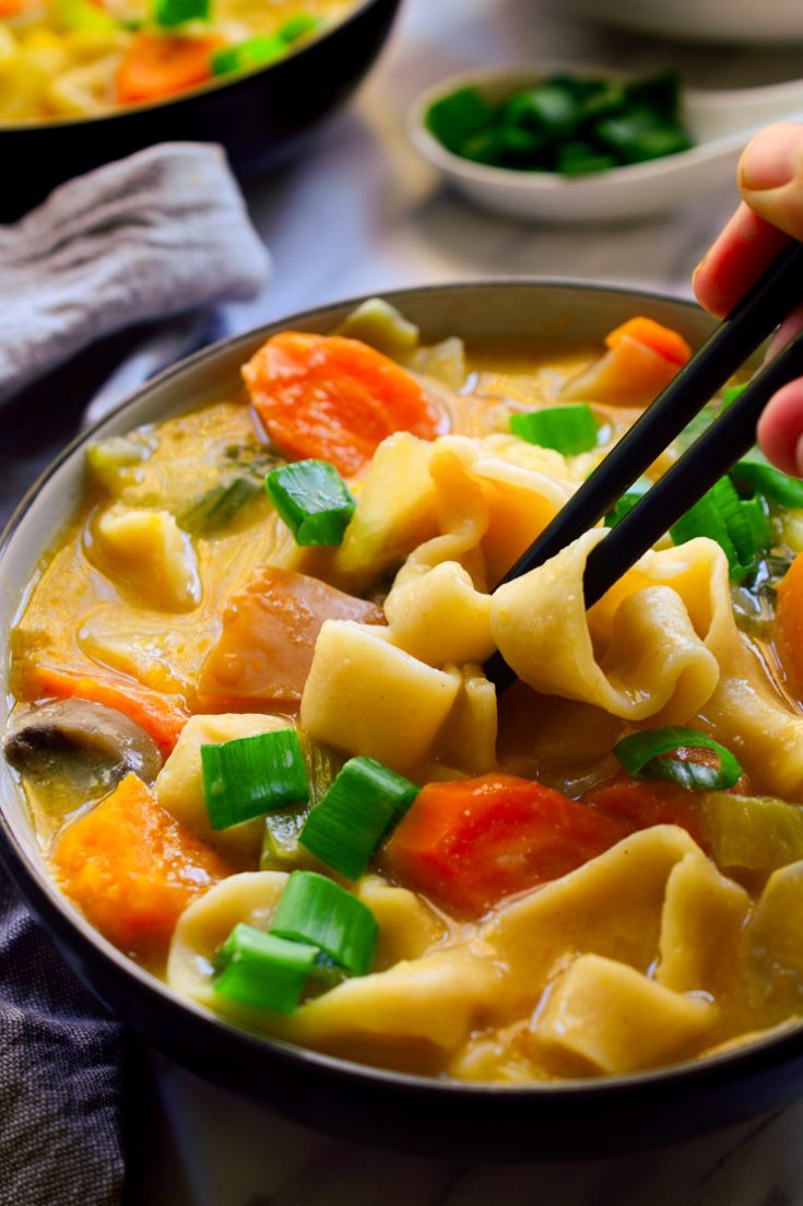 - Once the tougher veggies are almost tender, add your noodles. Simmer, covered, for 8 minutes, stirring occasionally to separate the noodles. Then add the leafy green parts of the bok choy, cabbage and green parts of the green onion. Simmer for 2 more minutes or until all the vegetables are tender.