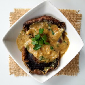 This recipe is based on a Spanish dish called pollo en pepitoria, which is chicken served in a sauce which has been prepared by thickening the juices of the bird with almonds and egg yolks. Sounds pretty gross, doesn’t it? I’ve never tried pollo en pepitoria as I’ve been vegetarian for much longer than I’ve lived in Spain, but preparing the sauce with a hearty mushroom stock and allowing the portobellos to release their liquid into the sauce makes a pretty tasty dish in its own right.